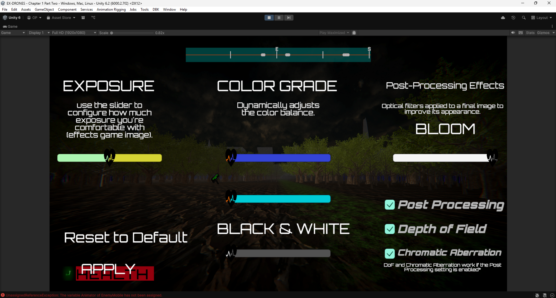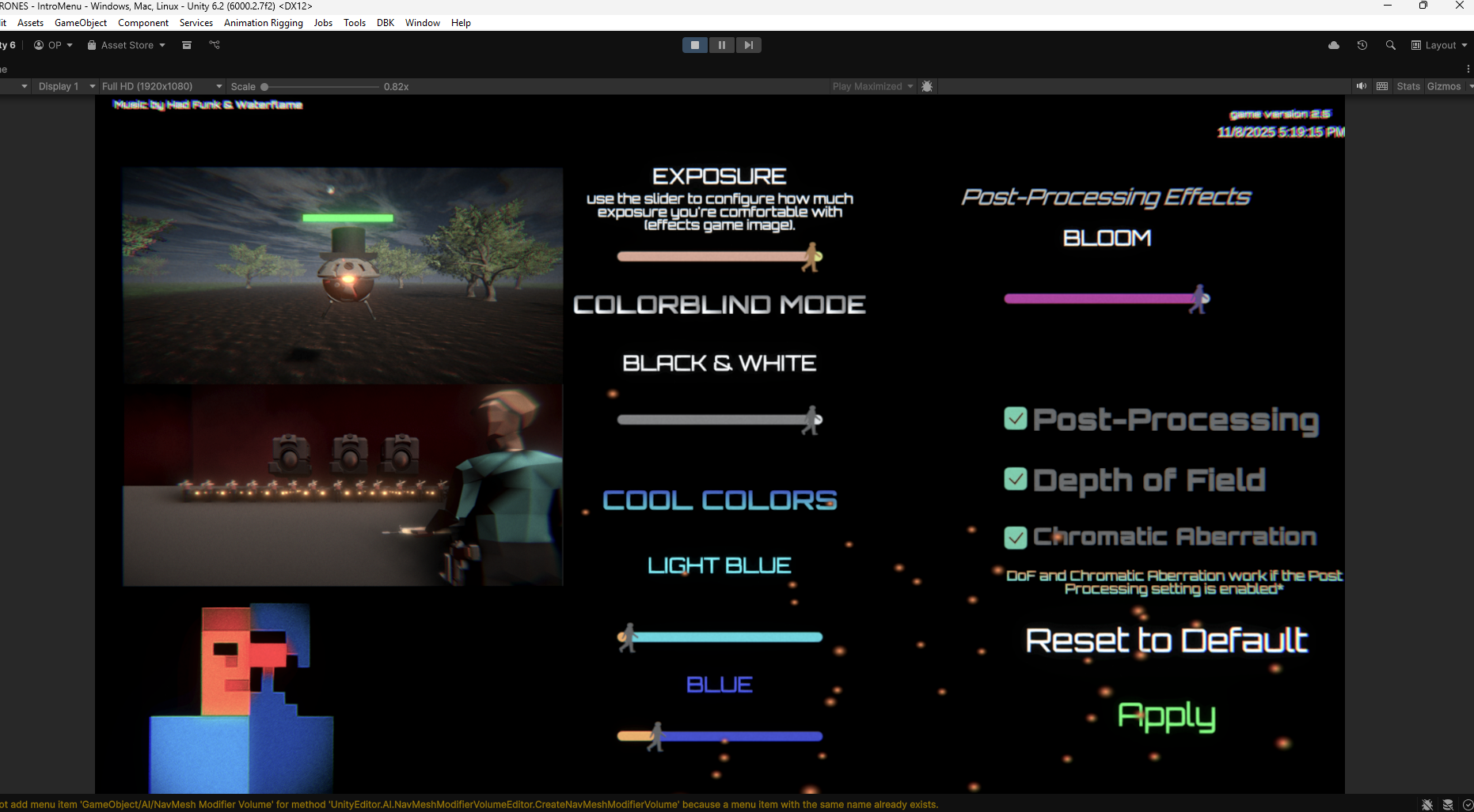 -COOL COLORS, adjust those 2 or 1 sliders to make a more cool/bluey image. We added these 2 sliders in order to help someone who has trouble staring at their monitor playing the game (for example, me). Some of our levels abuse the Orange color (Chapter 6, Chapter 7, Arena, Horde Mode). Cool Colors. And finally, we have the Post-Processing effects!
